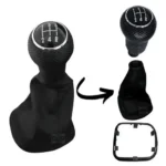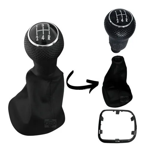 Conjunto de funda con pomo de palanca de cambios, diseñado para reemplazar la pieza original desgastada y mejorar el acabado interior del vehículo. Incluye aro cromado que aporta un estilo más moderno y elegante.