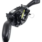 Se trata de una unidad de conmutador (palanca) para el sistema de intermitentes (direccionales) y limpiaparabrisas, diseñada para vehículos Volkswagen Gol y Volkswagen Saveiro de generaciones G6/G7. El componente incluye la palanca ergonómica montada sobre un vástago que conecta mediante mecanismo interno giratorio al conjunto de reloj de muelle (cinta airbag/sensor), identificado con el código original 6R0953501AG. El material principal del cuerpo externo es polímero de ingeniería (probablemente PA + GF) con destellos de textura superficial que coinciden con el diseño interior del volante, y el mecanismo interno contiene contactos metálicos, muelle de retorno y cinta enrollada para el sensor de airbag. La pieza cumple con especificaciones de fabricante para instalación directa (“plug & play”) en los modelos citados.