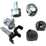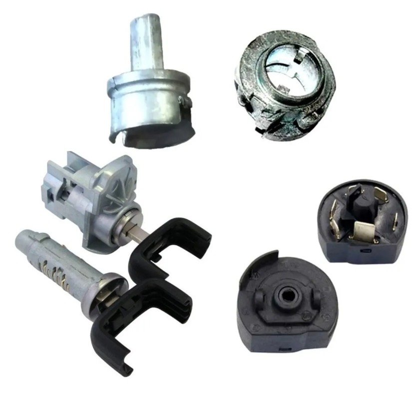 Conjunto de componentes del sistema de encendido y cierre mecánico del vehículo, diseñado para reemplazo completo del interruptor de arranque y cilindros de puerta. Permite restablecer el funcionamiento del encendido, arranque del motor y apertura/cierre manual de puertas.