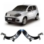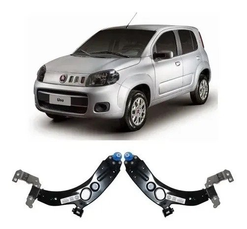 Par de bandejas de suspensión (brazos inferiores) para Fiat New Uno 2016, diseñadas para versiones con dirección hidráulica. Cada bandeja viene completa con bujes y rótula (pivote) ya instalados, listas para montaje. Fabricadas en acero de alta resistencia y con acabado anticorrosivo para garantizar durabilidad y un ajuste preciso al sistema de suspensión original del vehículo.