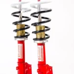 El sistema incorpora soportes inferiores y superiores compatibles con los puntos de fijación originales del vehículo, además de componentes como asientos de resorte regulables, contratuercas de bloqueo y, según versión, platos reforzados y topes de recorrido. La geometría del amortiguador está diseñada para mantener la alineación correcta de la suspensión tipo McPherson del eje delantero, asegurando funcionamiento estructural dentro de los parámetros del chasis.