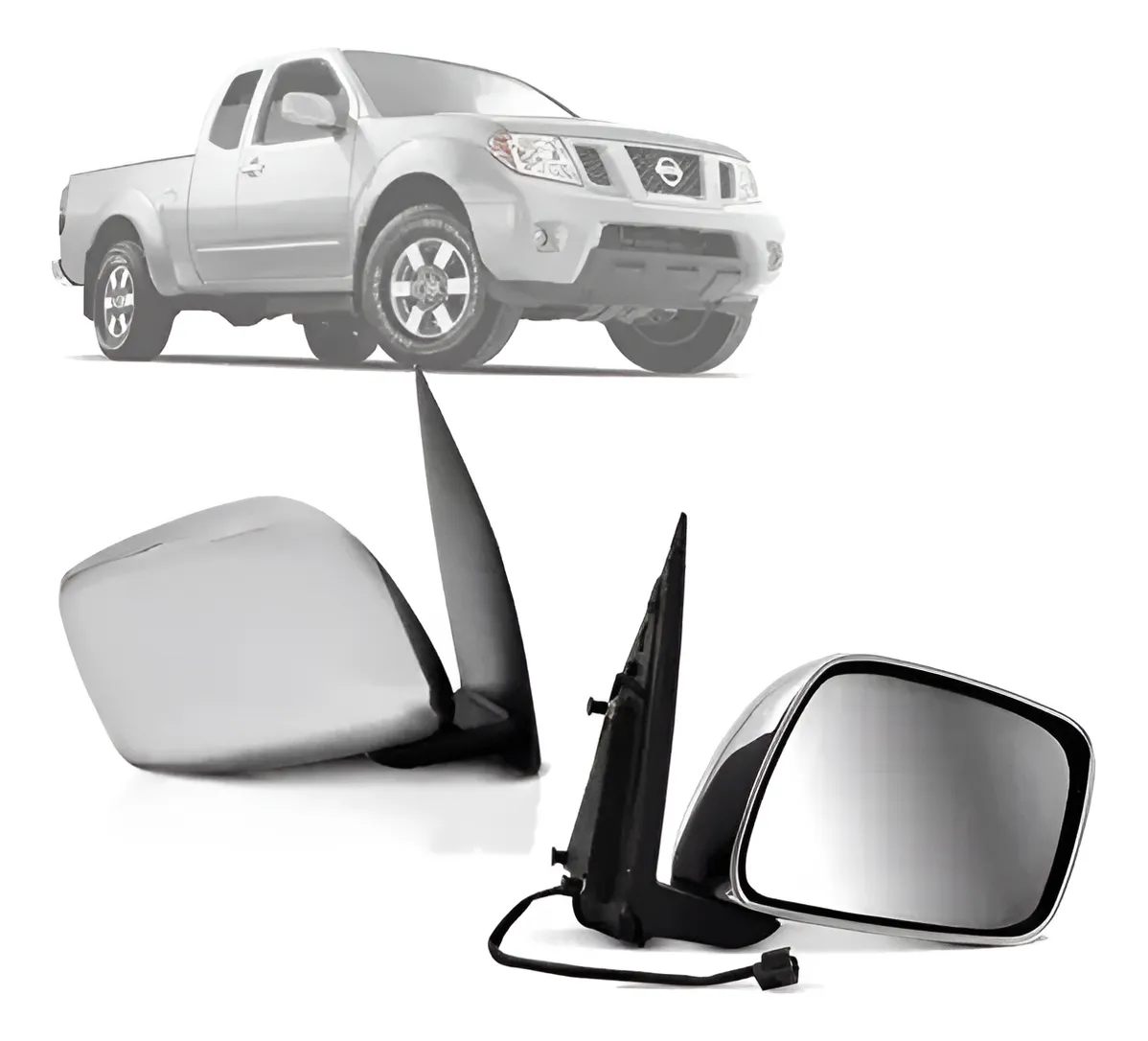 Retrovisor externo cromado con accionamiento eléctrico, diseñado para Nissan Frontier modelos 2008 a 2013. Fabricado en carcasa plástica de alta resistencia con acabado cromado, incorpora espejo regulable mediante motor eléctrico interno y base de fijación específica para la puerta del vehículo. Cuenta con estructura reforzada para soportar vibraciones y condiciones de uso en carretera, manteniendo ajuste firme y alineación adecuada con la carrocería. Compatible con sistema eléctrico original del vehículo y conexión directa al comando interno.